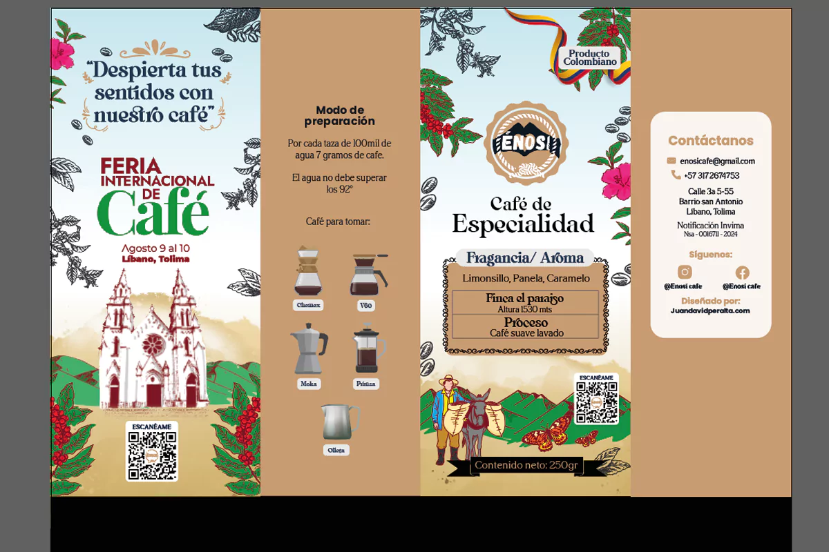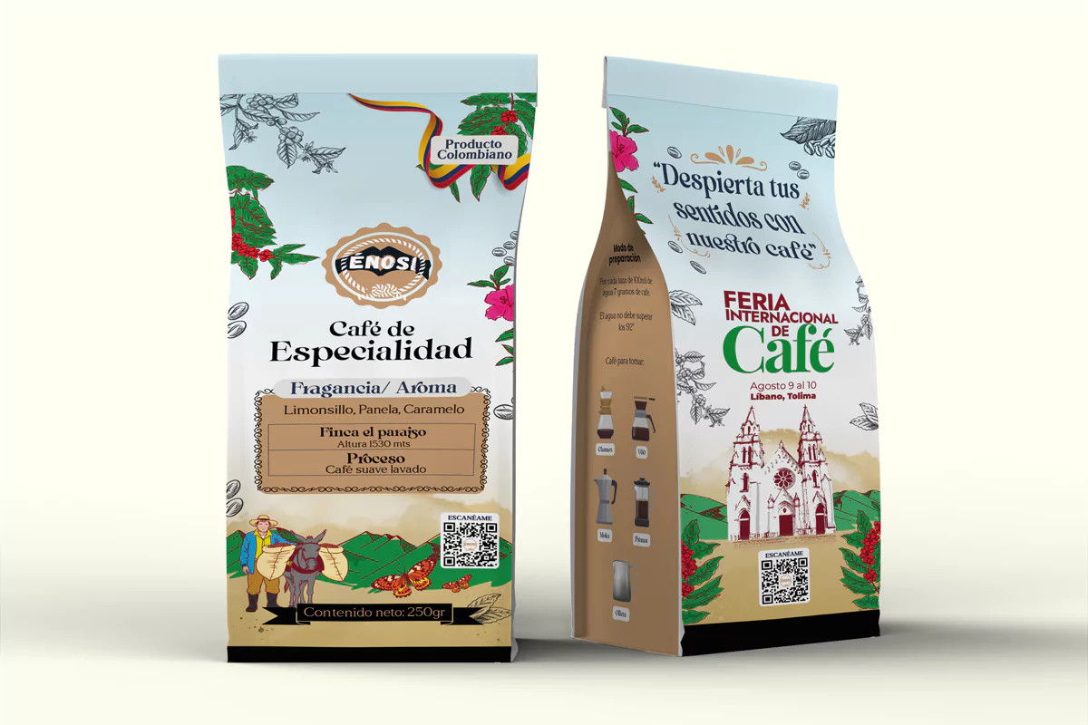 El empaque especial de Énosi Café para la 3ª Feria Internacional de Café “Tolima Corazón Cafetero”, celebra el orgullo y la pasión cafetera del Líbano, Tolima. Su diseño rinde homenaje a las montañas que nos abrazan, a la neblina que acaricia los cultivos y a las manos que, con dedicación, transforman cada grano en una experiencia única.