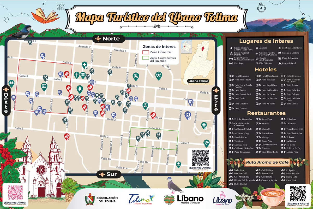 Se ha diseñado El Mapa Turístico del Líbano, Tolima que invita a descubrir la magia de este rincón cafetero a través de la Ruta Aromas de Café, un recorrido por las cafeterías más representativas del pueblo, donde cada taza cuenta una historia de tradición y sabor.